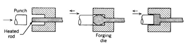 鍛粗或端壓鍛造通常是針對(duì)一均勻長桿的一端欲進(jìn)行鍛粗或造形而來,如下圖所示。將長桿在模子內(nèi)夾緊,其一端加熱至高溫,并順其軸向,再該端加壓,使其鍛粗或造形。