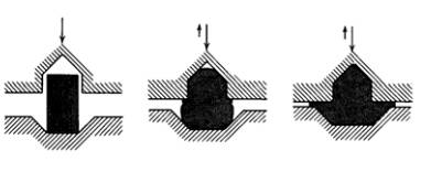 落錘鍛造與平面鍛造的不同,在于落錘鍛造的錘有模穴,工作件在模穴中承受兩方面的壓力或沖擊力作用,進(jìn)而依模穴的形狀作塑性變形。 如下圖所示,為了使金屬的流動(dòng)能確實(shí)而充份,往往將鍛造分為若干級(jí)次,每級(jí)的變化為漸進(jìn)式,以利控制流動(dòng)方向,至于級(jí)數(shù)的多寡, 端視鍛件的形狀與大小,金屬的可鍛性及工件尺寸精度要求。